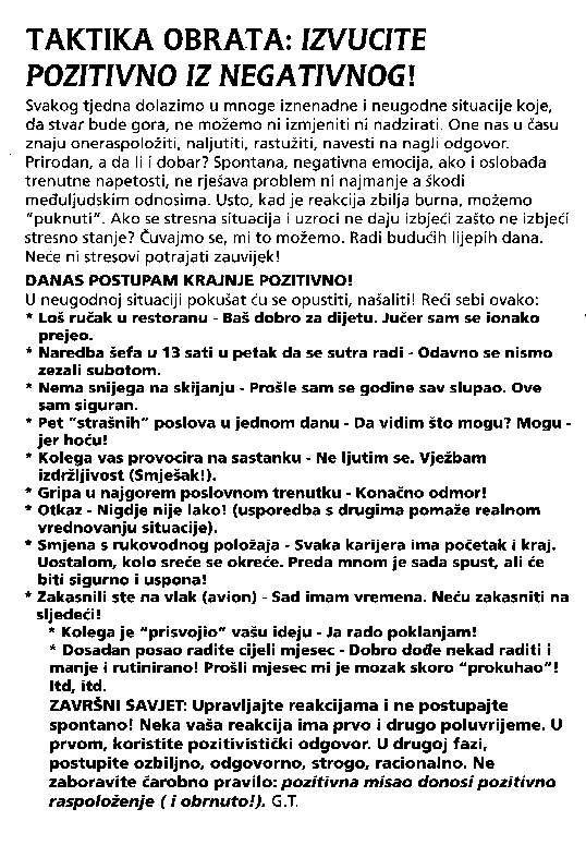 1. Strategijom protiv ometanja sa strane 2. Baratanje s predmetima 3. Sreća unatrag i sreća unaprijed 4. Izvucite pozitivno iz negativnog 5. Moć na poslu, u braku i politici 6. Kome još treba umjetnost ?